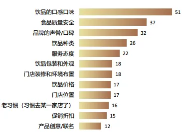 消费者选择茶饮品牌时最关注口感口味、食品安全、品牌口碑。口感口味依然是首要的考虑因素。除饮品本身的质量外,疫情时期消费者对质量的要求也在不断多元化,例如食材是否真材实料,保存条件是否合适等。品牌口碑对消费者来说也是质量的保证。