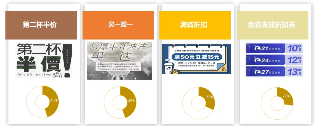 茶饮的消费场是景普遍和朋友家人一起消费享用,所以很多品牌均以“第二杯半价”、“买一赠一”、“满减折扣”的形式鼓励消费者进行报团购买。