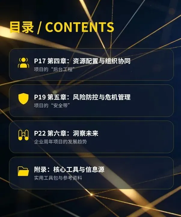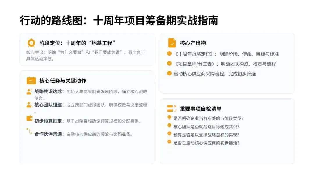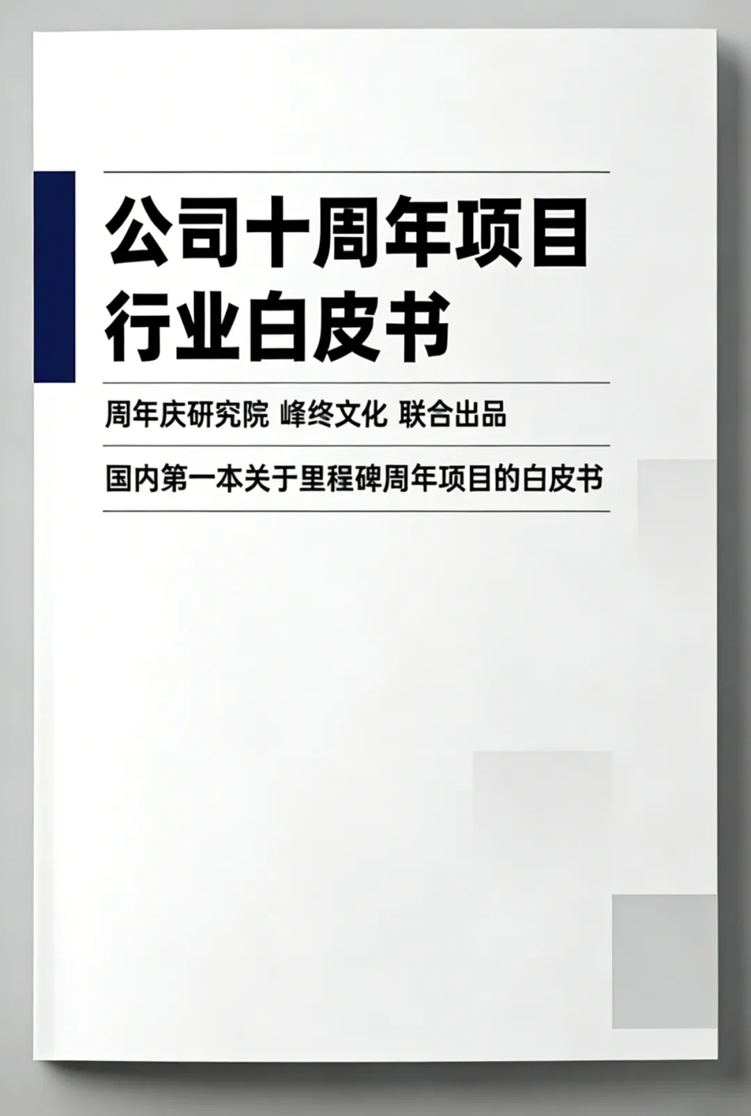企业周年庆大型专业研究机构“周年庆研究院”(微信公众号:周年庆创研院)基于对大量十周年项目深入研究与解读,联合周年庆专业策划落地团队“峰终文化”联合发布了这份《公司十周年项目白皮书》,旨在打破传统的“活动执行思维”,重新定义这一企业里程碑的价值。同时为企业内部项目关联者提供一套从战略对齐到价值量化的实战指南,让十周年项目真正成为值得所有成员铭记的“里程碑”。