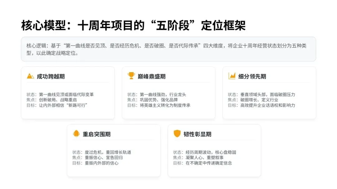 《白皮书》指出,卓越的周年项目本质是企业战略的外化。为何同样的十周年,不同企业会有完全不同的策划重心、叙事逻辑、活动设计与预算分配?研究发现这并不是随机产生的。十周年该怎么做,策略如何制定等等都需要更宏观的思考。书中构建了“五阶段”定位框架,揭示了处于不同经营阶段和状态的公司现状,与十周年项目战略定位之间的关联性。