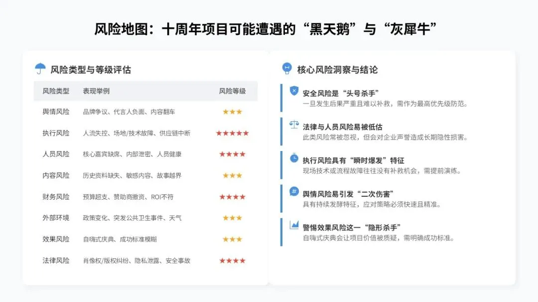 十周年项目是一次具有风险的“组织压力测试”。《白皮书》梳理了“风险地图”。基于此,报告构建了从“前置防控”到“实时监控”的完整体系。每一项措施都在回答一个问题:如果这里出问题,我们有没有Plan B?