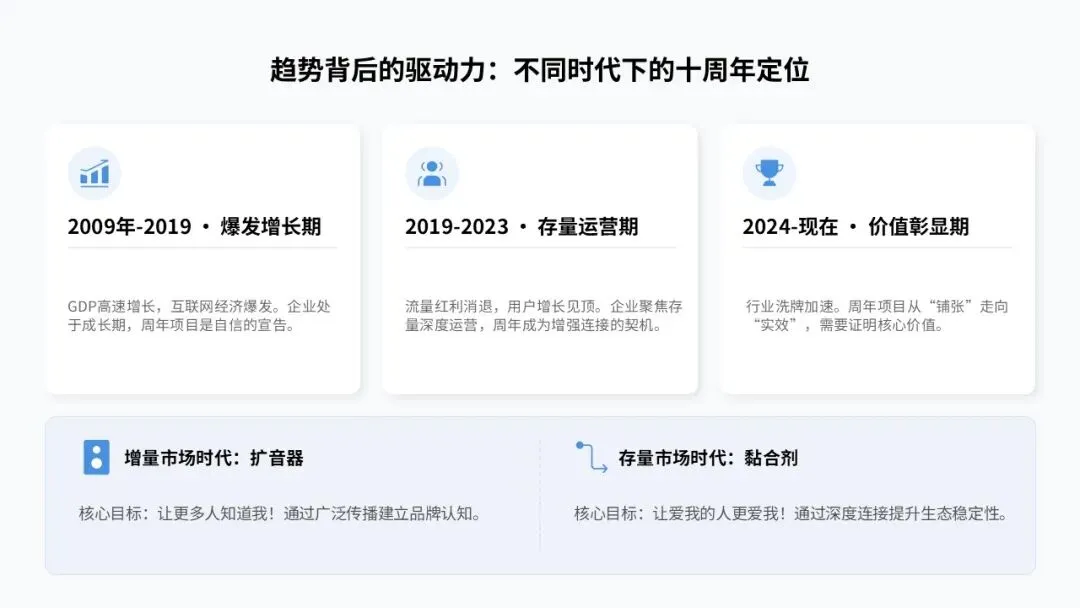 十周年项目的形态与内涵,从来不是孤立的创意迭代。它是宏观经济周期、技术革命浪潮、代际价值观变迁的集中投射。基于这个演变,报告预判了未来十年的五大趋势,但最终,所有趋势指向同一个方向:战略表达比预算规模更重要,情感共鸣比声光电更重要,价值证明比规模展示更重要。