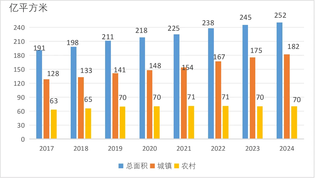 一是近年来新建建筑面积增长放缓,城镇居住建筑体量较大,是建筑面积增长的最主要来源。2010—2021年,我国建筑总面积从472亿平方米增加到713亿平方米,增长了51%,年均增长率达到3.8%。公共建筑面积从78亿平方米增加到150亿平方米,增长了91%,年均增长率达到6%;城市居住建筑面积从187亿平方米增加到333亿平方米,增长78%,年均增长率为5.4%。农村居住建筑面积受农村人口流出等因素的影响,仅增长11%。2022年以来,我国新建建筑面积增长放缓。2024年,房地产开发企业房屋施工面积73.32亿平方米,比上年下降12.7%。其中,住宅施工面积51.33亿平方米,下降13.1%;房屋竣工面积73.74亿平方米,下降27.7%。其中,住宅竣工面积53.74亿平方米,下降27.4%。