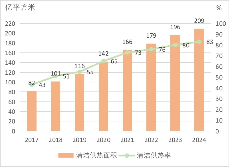 据清洁供热产业委员会(CHIC)统计,截至2024年底,我国北方地区供热总面积252亿平方米(城镇供热面积182亿平方米,农村供热面积70亿平方米)(见图1-5)。2024年,清洁供热面积209亿平方米,清洁供热率近83%(见图1-6),中央财政累计投入资金1209亿元,带动地方政府和社会投资超过4000亿元。相比2023年,清洁供热面积新增66亿平方米,清洁供热率比2023年新增7个百分点,增势较之前年份有大幅提升。