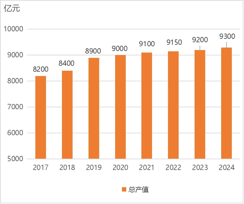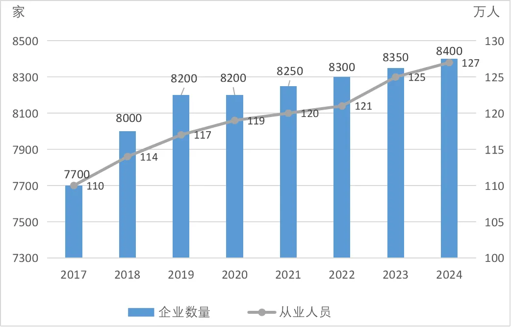 2017—2024年,随着能源结构的调整、市场机制的完善,我国北方地区清洁供热面积不断增加,生产总值随着市场需求而不断增加,我国清洁供热产业的营商环境呈现良好的态势。清洁供热企业从2017年的7700家扩大到2024年8400家;从业人员从110万人扩展到127万人;产业生产总值从8200亿元提升到9300亿元(见图1-7、图1-8)。