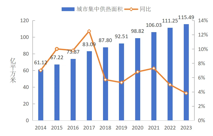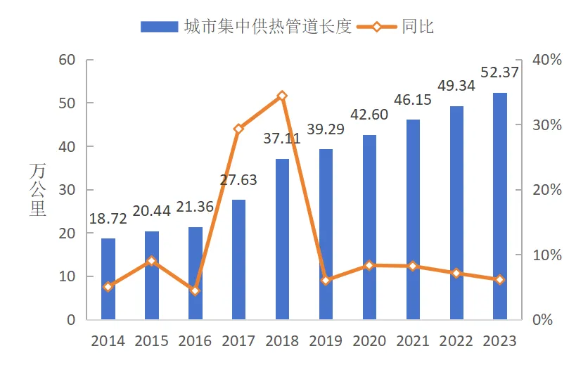 2024年10月25日,住房和城乡建设部发布《2023年中国城市建设状况公报》,截至2023年末,全国城市集中供热管道长度52.37万公里,同比增长6.13%;集中供热面积115.49亿平方米,同比增长3.81%。全国城市蒸汽集中供热能力12.39万吨/小时,同比下降1.30%;热水集中供热能力63.12万兆瓦,同比增长5.17%。