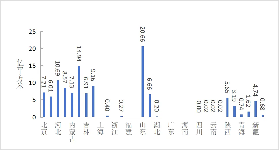 分省份看,山东、辽宁和河北3个省城市集中供热面积超过10亿平方米;黑龙江、山西、北京、内蒙古、吉林、河南、天津和陕西8个省(区、市)在5—10亿平方米之间;新疆、甘肃和宁夏3个省(区)在1—5亿平方米之间;青海、江苏、安徽、湖北、贵州、云南、西藏、四川8个省(区)和新疆兵团在1亿平方米以下;上海、浙江、福建、江西、湖南、广东、广西、海南和重庆9个省(区、市)无集中供热。