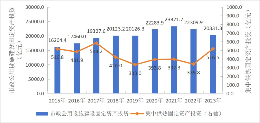 从固定资产投资看,2023年,全国城市市政公用设施建设固定资产投资总额20331.3亿元;其中集中供热固定资产投资516.1亿元,占全国城市市政设施投资总额2.5%,集中供热固定资产投资额较2022年的339.8亿元,增加了51.9%(见图1-12)。