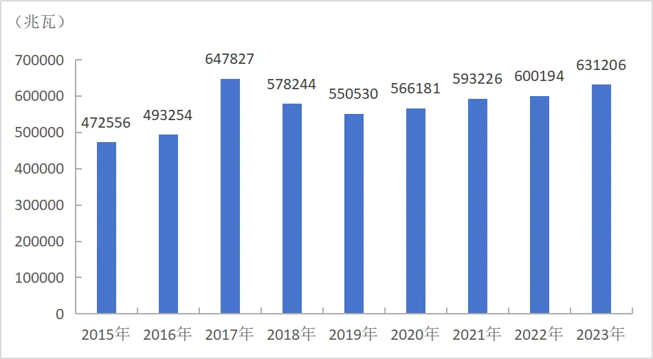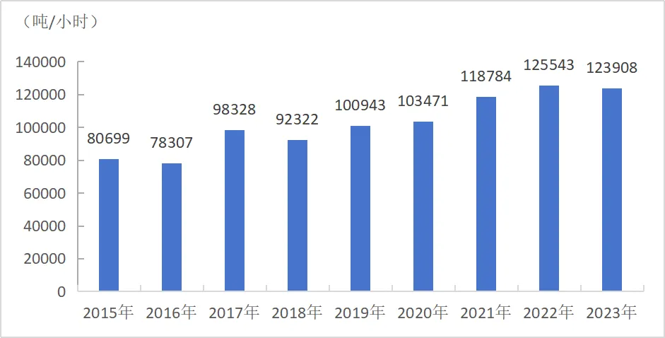从供热能力看,2015—2023年我国城市供热能力整体提升。2023年我国蒸汽供应能力约为123908吨/小时,我国热水供应能力约为631206兆瓦(见图1-13、图1-14)。