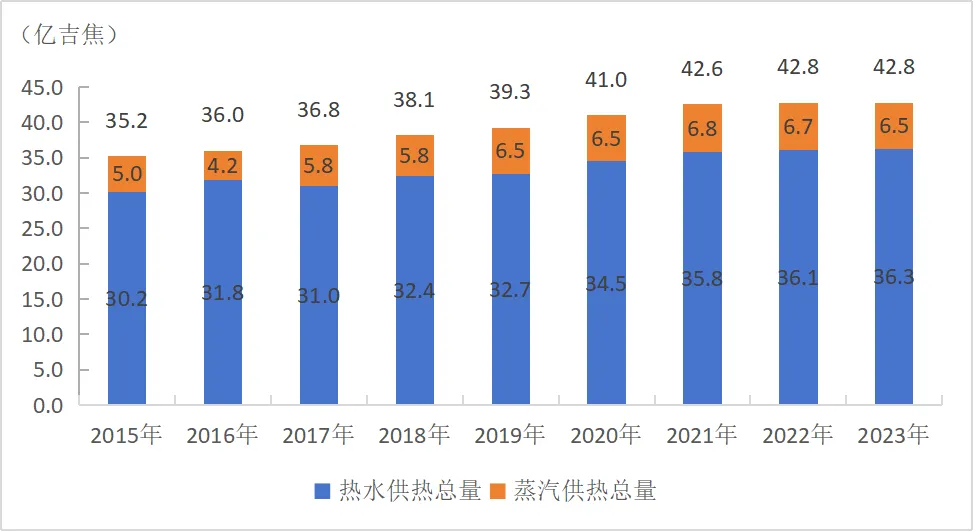 从供热总量看,2023年,我国蒸汽供热总量为6.5亿吉焦,占城市供热总量的15.2%;热水供热总量为36.3亿吉焦,占城市供热总量的84.8%,是我国城市供热主流(见图1-15)。