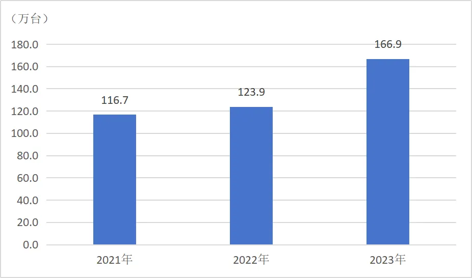 “煤改电”技术路径中产品种类较为繁杂,包括电暖气、电暖桌、碳晶类等,这些产品在应用中的实际体验和能耗高低成为了零售市场竞争的重要因素。从近几年的市场表现来看,空气源热泵相比其他产品在用户体验和运行成本方面具有一定优势,市场增长态势明显。根据中国节能协会热泵专业委员会《2023年中国热泵产业发展年鉴》,空气源热泵近三年市场销售量如图1-20所示,2023年,空气源热泵市场销售量达166.9万台,与上一年相比,增幅高达34.7%。从区域分别来看,北京空气源热泵置换潜力的释放将进一步成为市场热点,目前,河北、辽宁是零售市场发展的主要区域,政府项目主要分布在辽宁、内蒙古、宁夏、甘肃、新疆和青海。