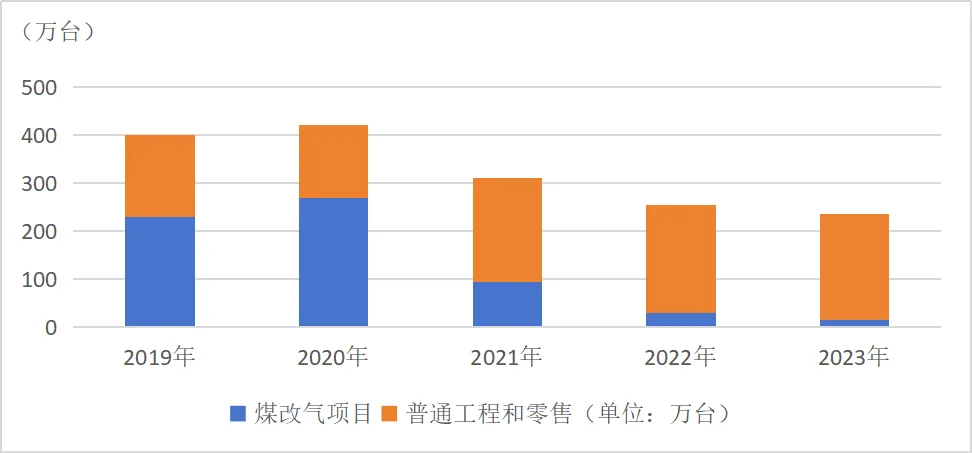 近三年“煤改气”市场销量整体下滑,但普通工程和零售市场呈逆势增长。根据中国土木工程学会燃气分会《燃气采暖热水炉产品2023年度市场统计公告》,2023年,普通工程和零售市场的燃气热水炉销量保持稳定,全年销量达222万台,占全年总销量的93.7%;“煤改气”政府项目燃气采暖热水炉销量进一步下降至15万台,于2022年相比降幅高达53.1%,占全年总销量的6.3%,如图1-21所示。政府项目市场主要分布在西北地区的宁夏、甘肃等省份,其次是山东、内蒙古等。
