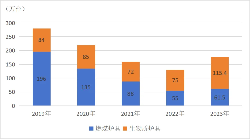 生物质炉具在清洁炉具市场中占据主导地位,当前生物质炉具的快速发展主要依托政府项目采购,特别是东北和西北地区的清洁取暖改造项目需求集中释放。其中,生物质壁炉配套颗粒燃料销售的市场化程度提高,且逐年上升;燃木壁炉开始热销市场,用户以农村别墅类、乡镇农村小商铺等分散供暖为主。根据《中国散煤综合治理研究报告2024》,2023年炉具行业骨干企业的清洁炉具年销售量在经历了连续3年的下滑后,实现了首次增长,销量总量约176.9万台,相比2022年的销量水平增长了36%。其中,生物质炉具销量创下新高,约115.4万台,占炉具总销量的65%;燃煤炉具销量在连续3年下滑的基础上,2023年出现小幅反弹,销售总量约61.5万台,如图1-19所示。