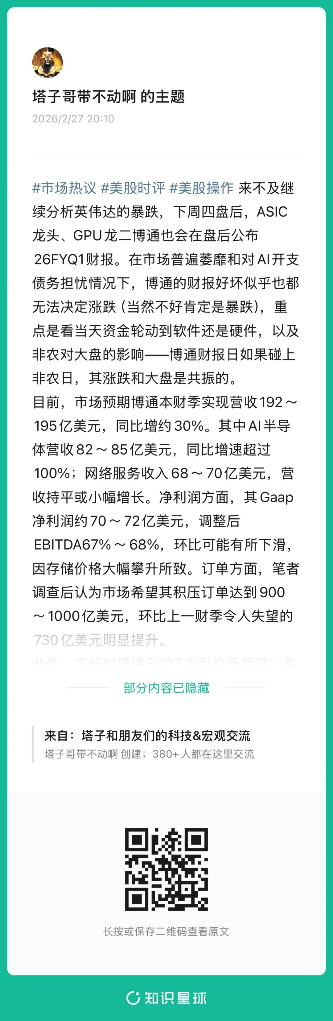 - 预期26FY其AI芯片相关营收为520~550亿美元,同比增速超过140%,电话会议管理层预期27FY营收可能达到千亿美元级别。