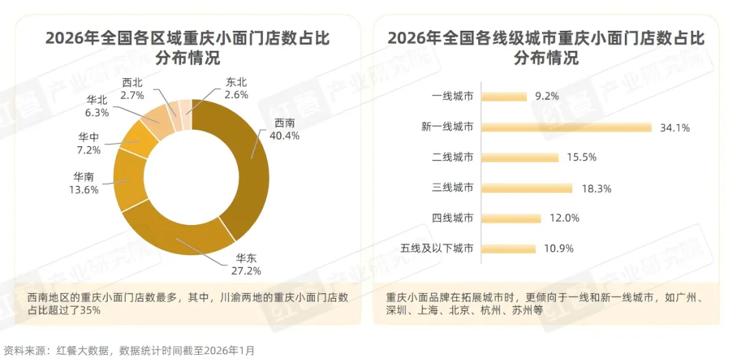 从重庆小面的门店分布来看,西南地区仍占据着较多的重庆小面门店,但已从川渝发源地向全国化扩张。据红餐大数据,截至2026年1月,西南地区的重庆小面门店数占比为40.4%,其中川渝地区的门店数占比超过了35%。此外,华东和华南地区的重庆小面门店数占比也较高,分别为27.2%和13.6%,诸如广东、浙江、江苏、福建、山东等省级行政区均有较多的重庆小面门店。