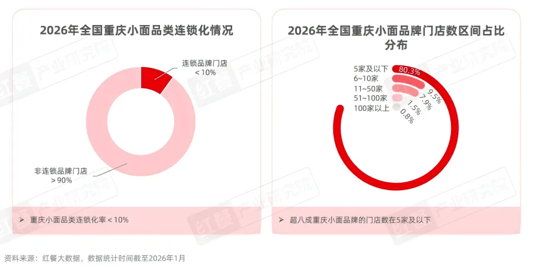 与面馆大赛道相似,重庆小面赛道当前仍以夫妻店、街边摊为主,连锁化水平和品牌规模化程度整体偏低。红餐大数据显示,截至2026年1月,重庆小面品类连锁化率不足10%。其中,80.3%的品牌门店数在5家及以下,而门店数在100家以上的品牌数占比仅为0.8%。
