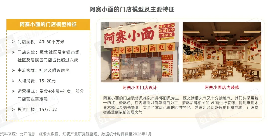 比如定位于“平价社区面馆”的阿赛小面,其人均消费在15~20元区间,门店面积多在40至60平方米。在门店选址上,阿赛小面主要聚焦社区与乡镇市场,通过建立稳定的顾客关系实现高频复购。凭借轻量化门店模型和较低的投资门槛(15万元起),阿赛小面实现了门店的快速扩张。红餐大数据显示,截至2026年1月,其门店数已突破100家,其中2025年其新开门店超过80家。