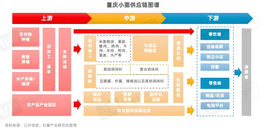 近年来,重庆小面赛道的蓬勃发展和品牌的快速崛起,离不开供应链企业的助力和产业链的不断完善。目前,重庆小面已形成一条涵盖上游原材料种植/养殖、食材加工、调味料生产、中游物流配送到下游餐饮与零售市场的完整产业链。