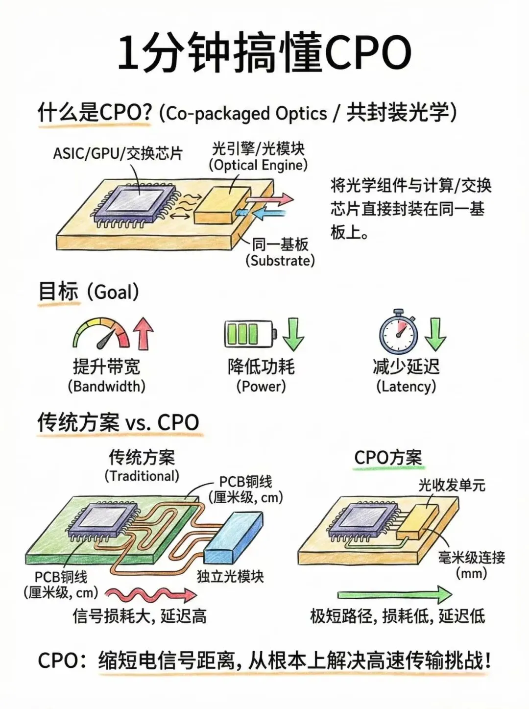 CPO(Co-packaged Optics)即共封装光学,将光引擎、硅光芯片与交换ASIC/算力芯片在同一封装基板上高密度集成,电信号传输距离从厘米级缩短至微米级,从根源解决高速互联三大痛点: