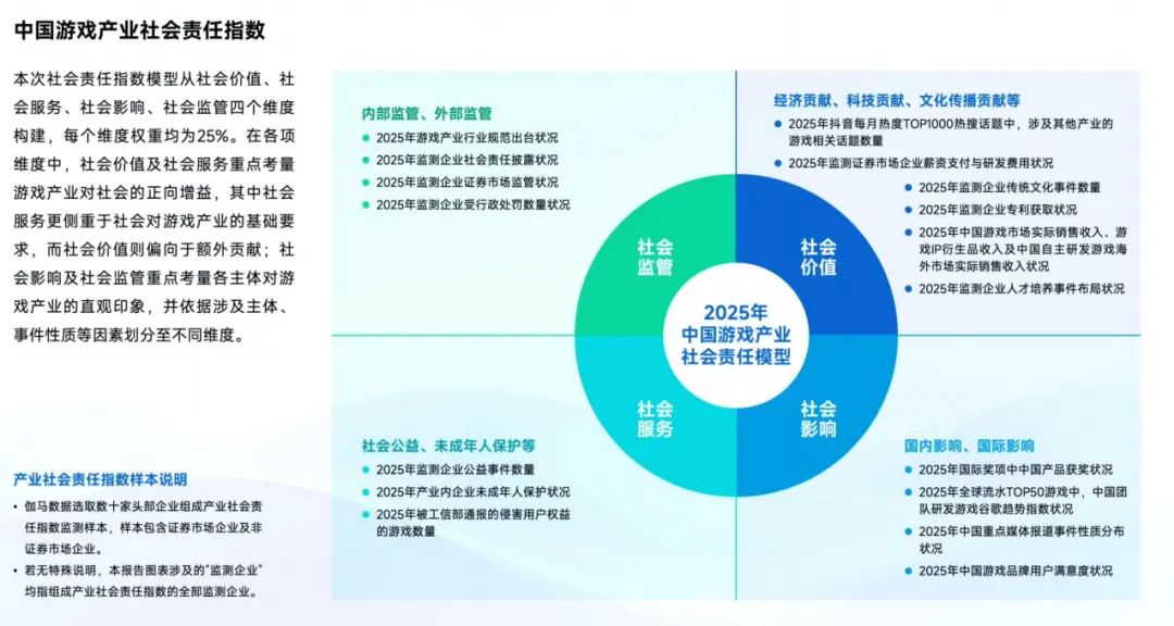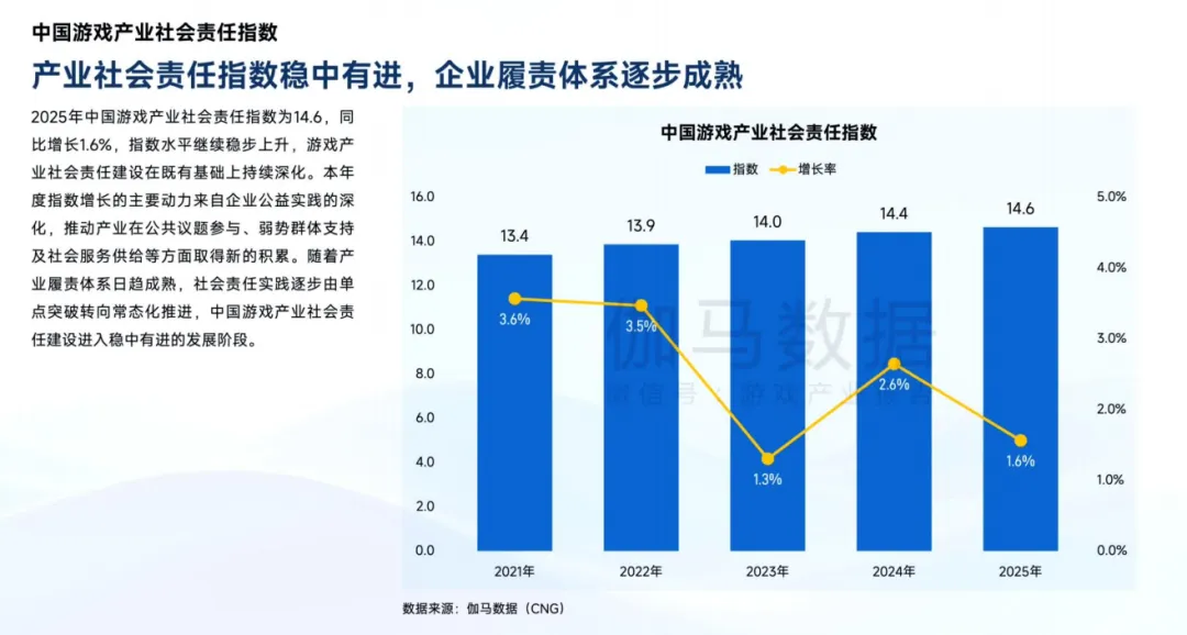 伽马数据《2025 中国游戏企业社会责任报告》核心结论:中国游戏产业社会责任指数达 14.6,同比增长 1.6%,进入稳中有进的发展阶段。企业履责从单点突破转向常态化、体系化推进,社会服务(公益实践、信息安全)贡献最突出,技术赋能(AI 公益、人才培养)与文化传播(非遗数字化、文化出海)成为核心亮点,未成年人保护迈向家庭协同新阶段。