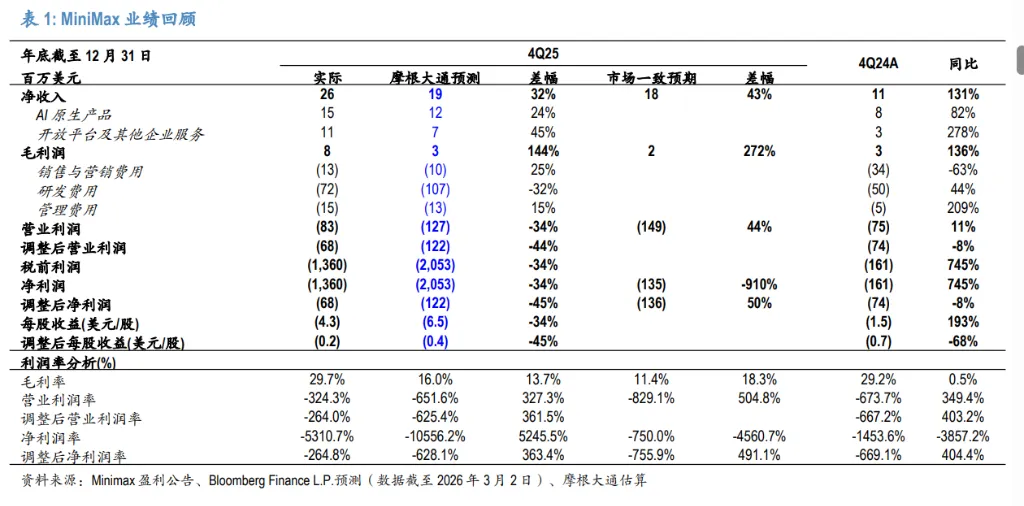 MiniMax在2025年第四季度实现了2600万美元的净收入,同比增长高达131%。这一数字不仅超出了摩根大通预测的1900万美元(高出32%),也高于彭博一致预期的1800万美元(高出43%)。