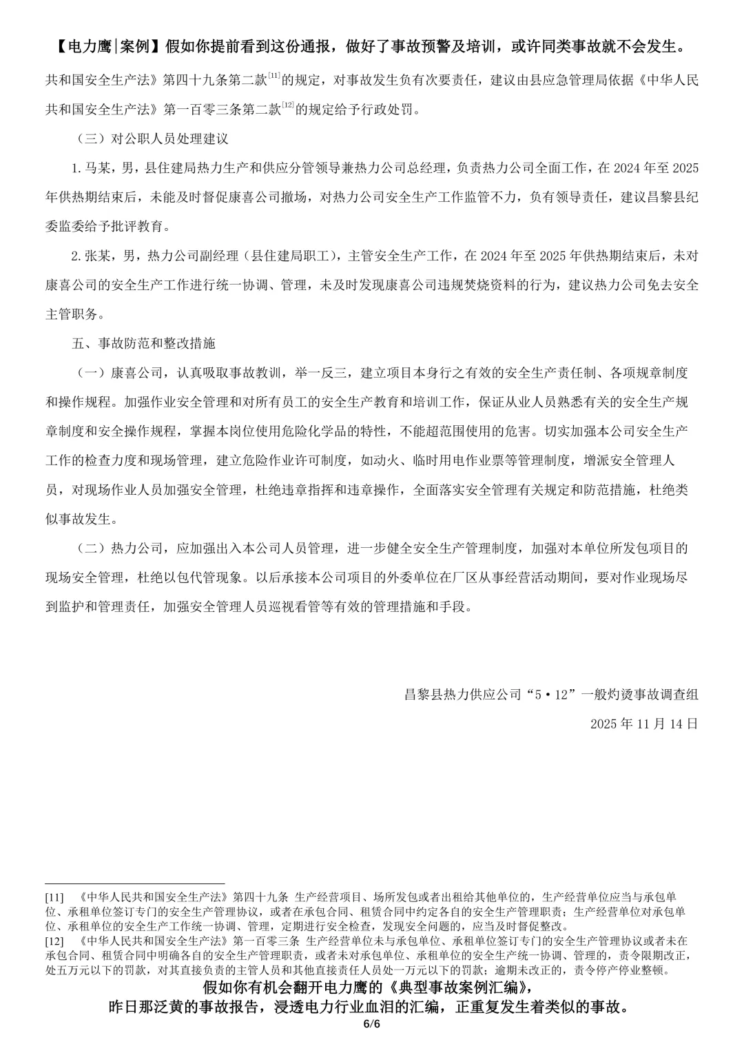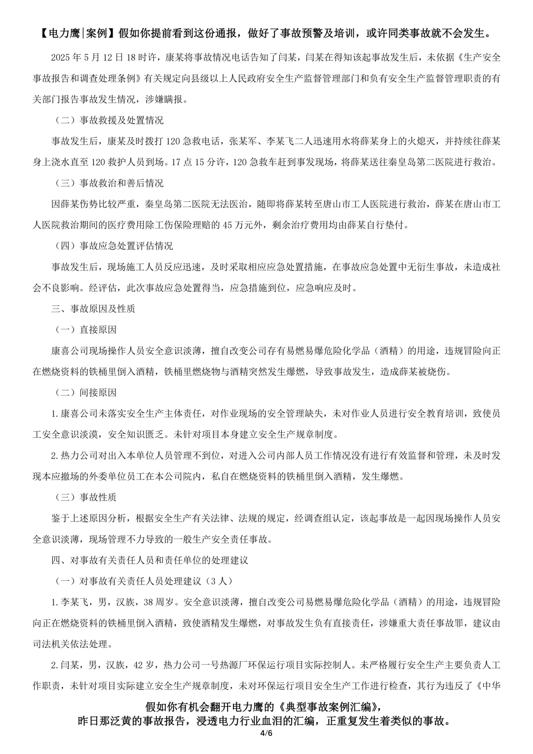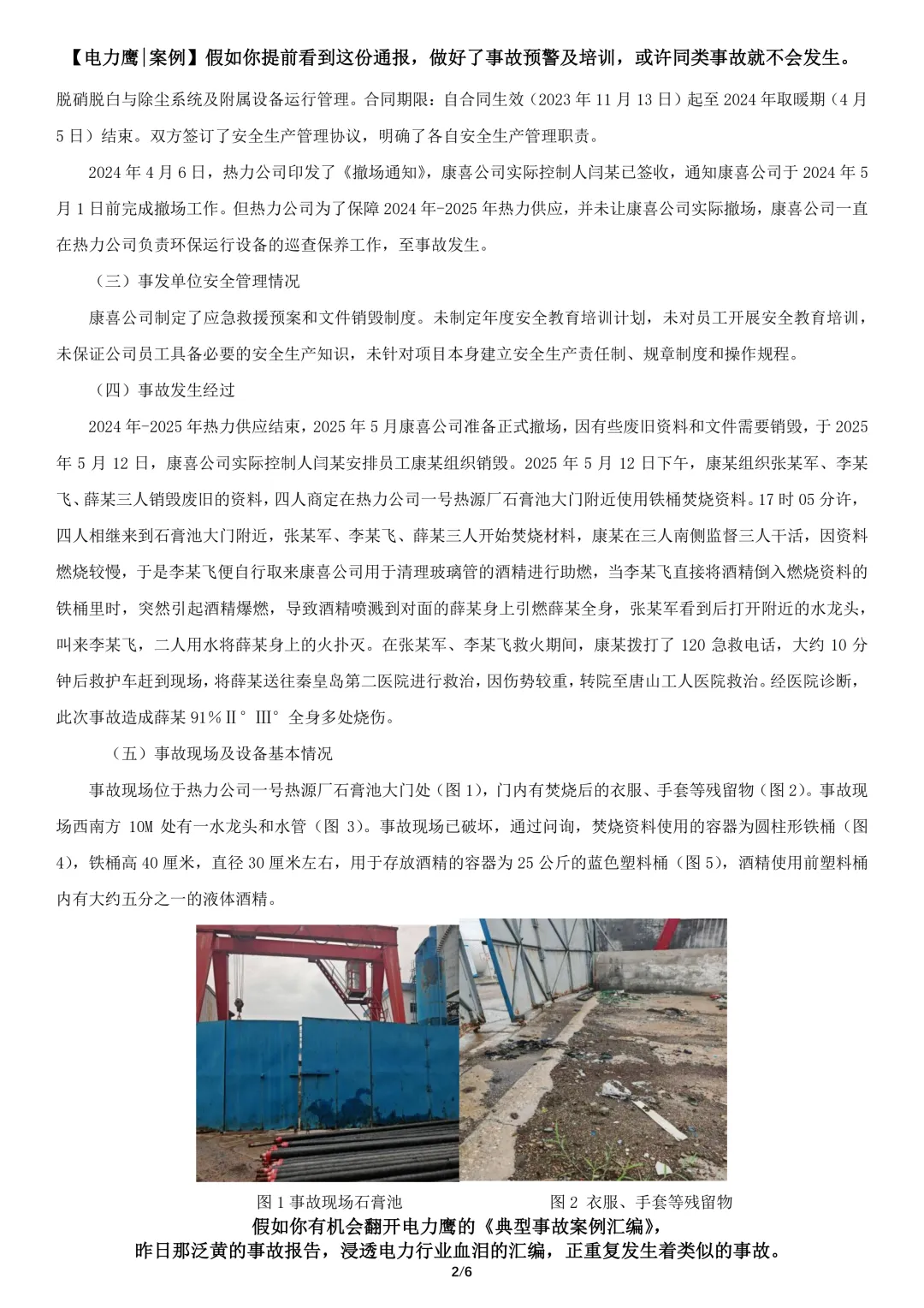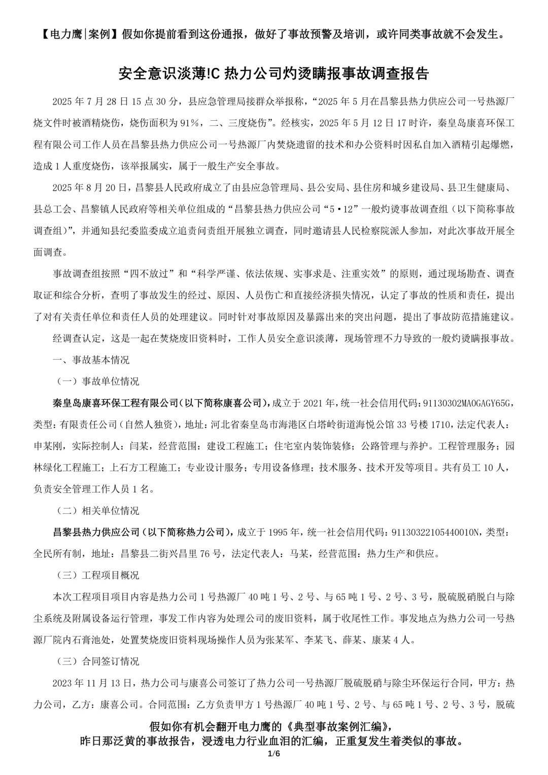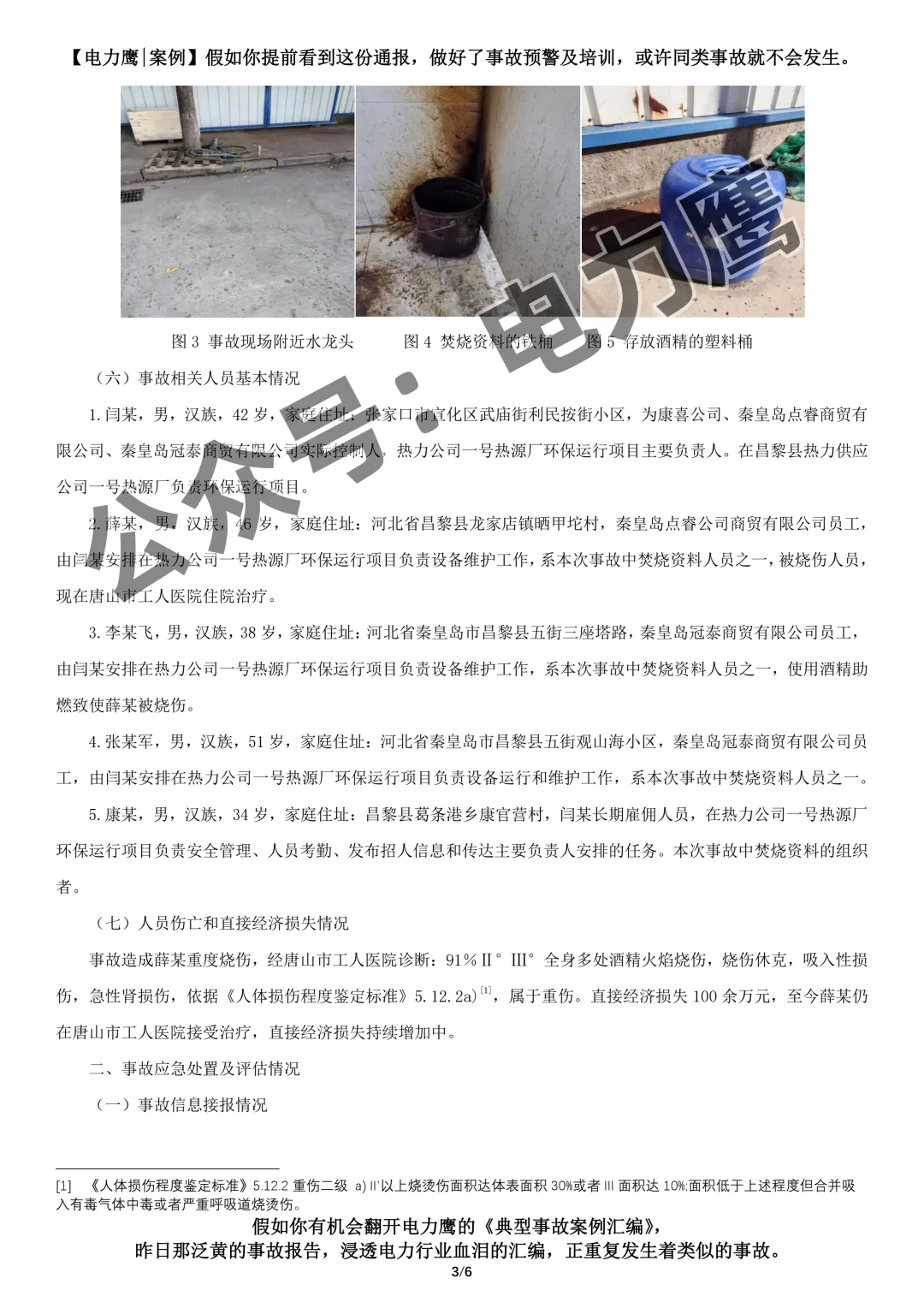 【电力鹰|案例】2025年5月在昌黎县热力供应公司一号热源厂烧文件时被酒精烧伤,烧伤面积为91%,二、三度烧伤”。经核实,2025年5月12日17时许,秦皇岛康喜环保工程有限公司工作人员在昌黎县热力供应公司一号热源厂内焚烧遗留的技术和办公资料时因私自加入酒精引起爆燃,造成1人重度烧伤,该举报属实,属于一般生产安全事故。