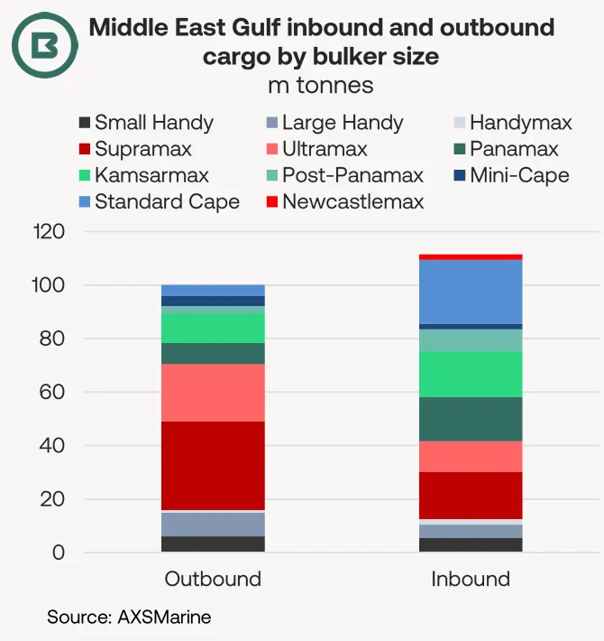 AXSMarine数据显示,去年从中东海湾地区(即巴林、伊朗、伊拉克、卡塔尔、阿联酋和沙特阿拉伯湾区)前往除海湾外其他地区的出口干散货贸易量达到1亿吨,而进口量为1.12亿吨。