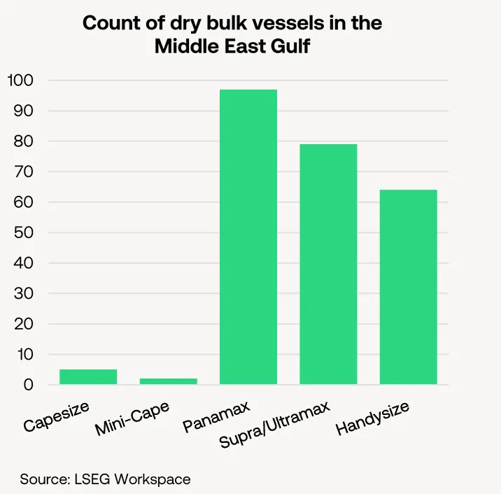 考虑到单票货量相对较小,一个比较显著的现象是:在中东海湾的出口贸易中,有大量带吊船参与运输,尤其是 Supra / Ultramax 型船——按货量计算,大约占 70%。