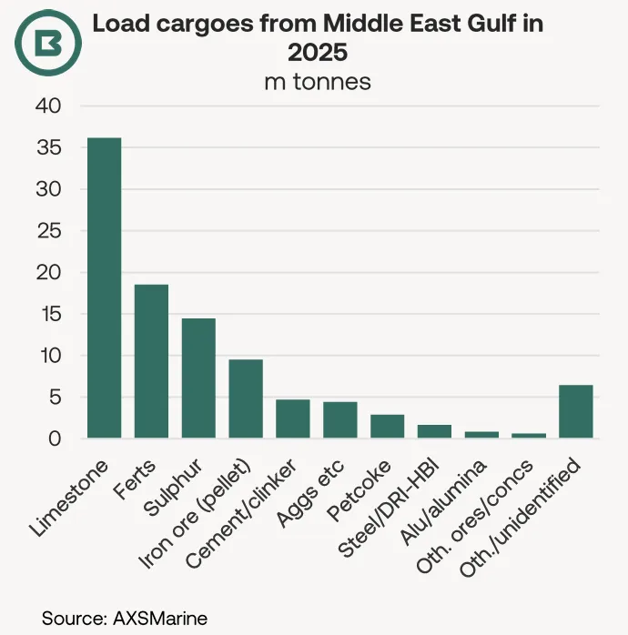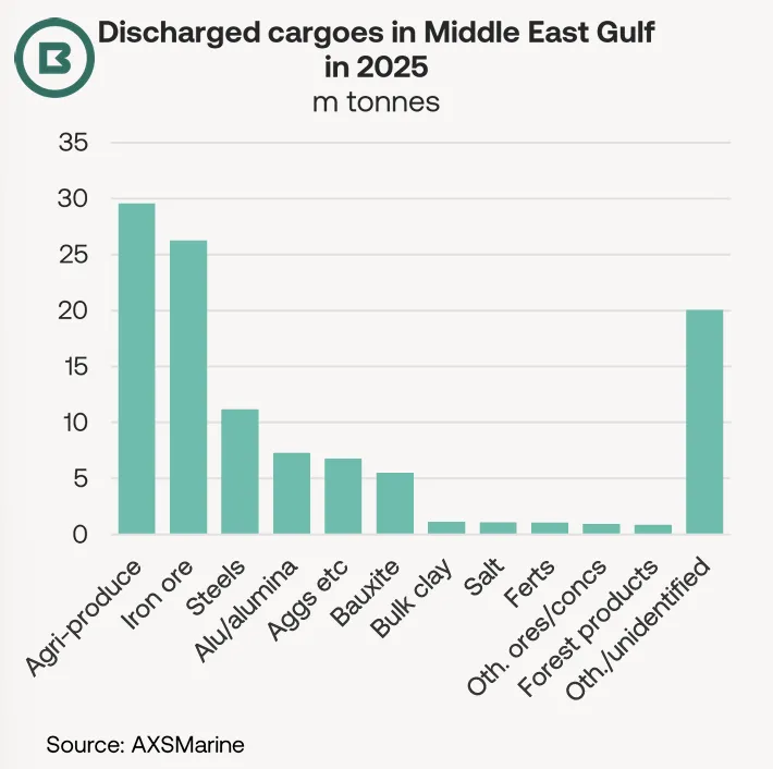 下图反映了2025年巴林、伊朗、伊拉克、卡塔尔、阿联酋和沙特阿拉伯湾区的海运干散货贸易情况(按货物类型划分)。