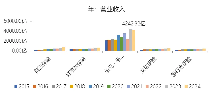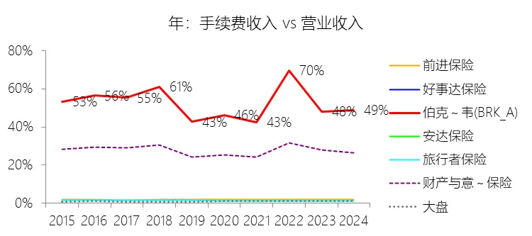 手续费收入:2025年,伯克希尔哈撒韦-A的手续费收入为2040.61亿美元,同比减少1.54%,与营业收入的比例为49.71%,同比上升0.85个百分点;2015-2024年(十年),此项合计为15159.83亿美元,平均比例为51.08%,比财产与意外伤害保险行业的均值高23.65个百分点,长期呈下降趋势。