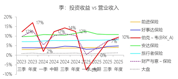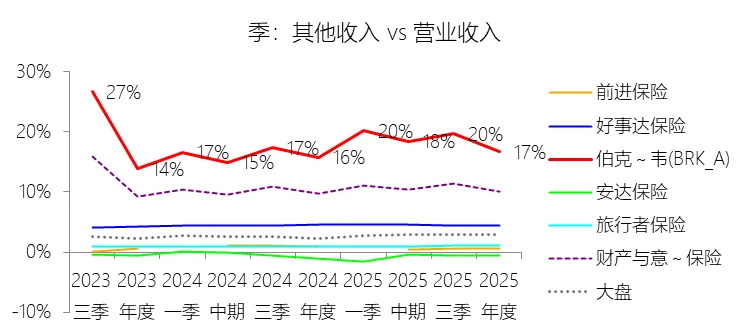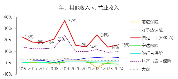 其他收入:2025年,伯克希尔哈撒韦-A的其他收入为684.47亿美元,同比增长2.62%,与营业收入的比例为16.67%,同比上升0.95个百分点;2015-2024年(十年),此项合计为5770.81亿美元,平均比例为19.44%,比财产与意外伤害保险行业的均值高7.15个百分点,长期呈下降趋势。