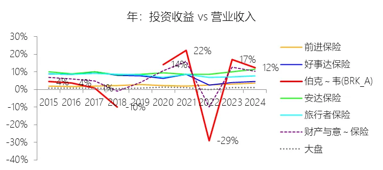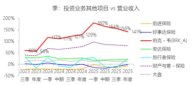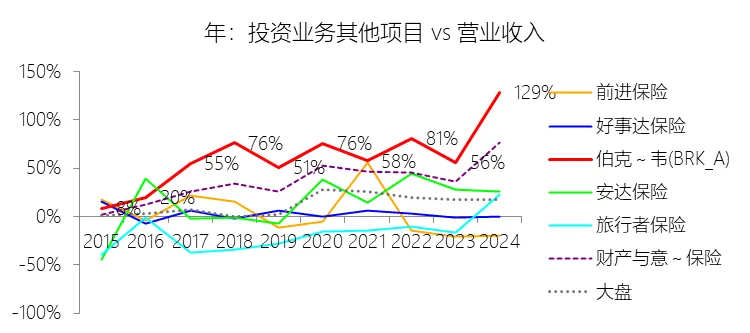 投资业务其他项目:2025年,伯克希尔哈撒韦-A的投资业务其他项目为5805.66亿美元,同比增长6.49%,与营业收入的比例为141.42%,同比上升12.92个百分点;2015-2024年(十年),此项合计为19385.30亿美元,平均比例为65.32%,比财产与意外伤害保险行业的均值高25.85个百分点,长期呈上升趋势。
