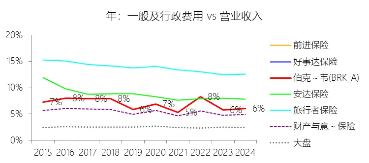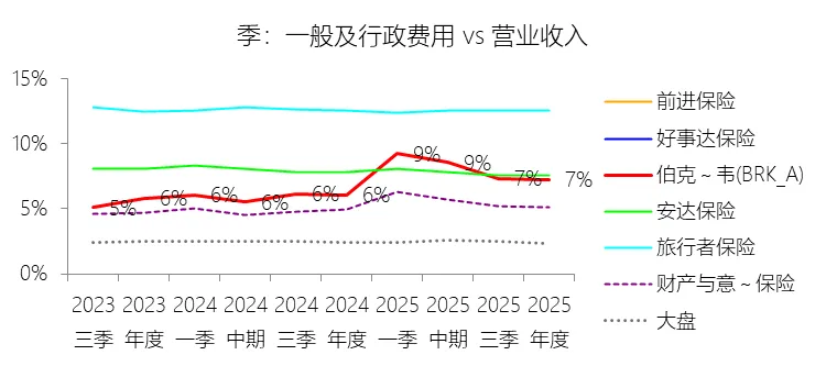 一般及行政费用:2025年,伯克希尔哈撒韦-A的一般及行政费用为297.35亿美元,同比增长15.96%,与营业收入的比例为7.24%,同比上升1.2个百分点;2015-2024年(十年),此项合计为1988.11亿美元,平均比例为6.70%,比财产与意外伤害保险行业的均值高1.38个百分点,长期呈下降趋势。