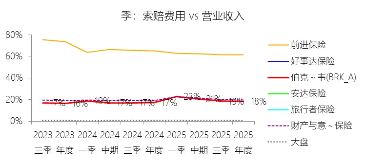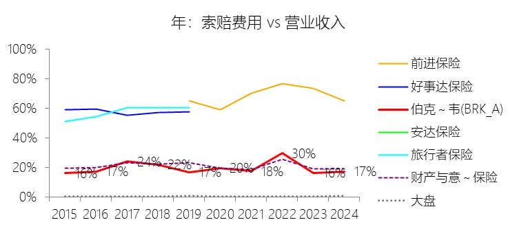 索赔费用:2025年,伯克希尔哈撒韦-A的索赔费用为750.63亿美元,同比增长2.83%,与营业收入的比例为18.28%,同比上升1.08个百分点;2015-2024年(十年),此项合计为5703.05亿美元,平均比例为19.22%,比财产与意外伤害保险行业的均值低1.69个百分点,长期呈上升趋势。