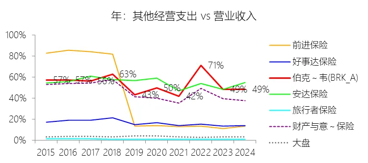 其他经营支出:2025年,伯克希尔哈撒韦-A的其他经营支出为2016.11亿美元,同比减少2.19%,与营业收入的比例为49.11%,同比上升0.52个百分点;2015-2024年(十年),此项合计为15472.31亿美元,平均比例为52.13%,比财产与意外伤害保险行业的均值高7.43个百分点,长期呈下降趋势。