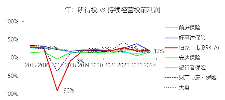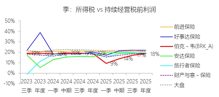 所得税率:2025年,伯克希尔哈撒韦-A的所得税为151.99亿美元,同比减少26.98%,与持续经营税前利润的比例为18.43%(所得税率),同比下降0.43个百分点;2015-2024年(十年),此项合计为875.24亿美元,平均比例为15.44%,比财产与意外伤害保险行业的均值低1.15个百分点,长期呈上升趋势。