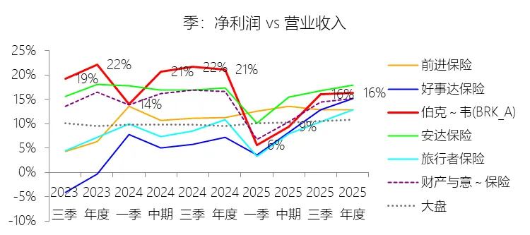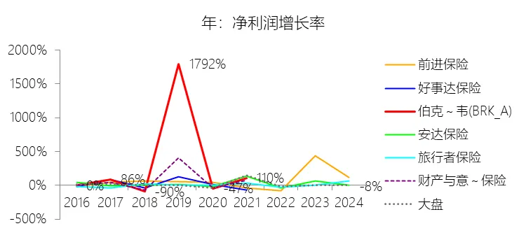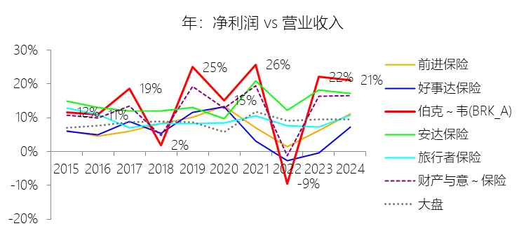 营业收入增长率:2025年,伯克希尔哈撒韦-A的营业收入为4105.22亿美元,同比减少3.23%,增速同比上升0.21个百分点;2015-2024年(九年)增长101.11%,年复合增长8.07%,比财产与意外伤害保险行业的复合增速低0.23个百分点,长期呈上升趋势。此项包括Total revenues和Investment gains (losses)。增速短期上升主要由于2025年保险保费收入同比增长0.73%至889.02亿美元,且租赁收入、利息与股利等投资收益也实现了增长,这些因素部分抵消了投资收益(含未实现损益)较去年同期下降25.99%带来的负面冲击,使得营业收入整体降幅由2024年的3.44%收窄至3.23%。增速长期上升主要由于伯克希尔在过去十年间坚持多元化扩张策略,通过大规模收购Alleghany、Pilot Travel Centers及Precision Castparts等企业持续增加收入来源,并依靠保险浮存金从2015年的880亿美元翻倍至2025年的1760亿美元,为投资规模的稳步扩张提供了充足资本。增速低于财产与意外伤害保险行业的复合增速主要由于伯克希尔的营业收入项包含受市场波动影响剧烈的投资损益(Investment gains/losses),自2018年会计准则变更后,未实现损益的波动常导致收入增速出现非对称的大幅波动,且公司规模已占到运营领域近6%的份额,受“复利数大”的制约,其非保险业务如铁路(BNSF)和能源(BHE)在面临运量下降或监管挑战时,增速往往低于处于强制定价上行周期的纯保险行业。