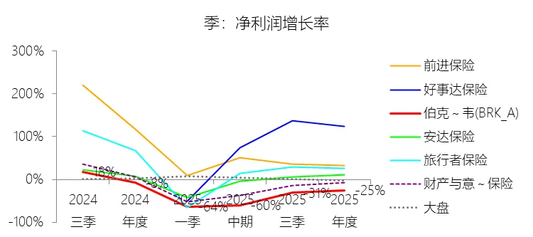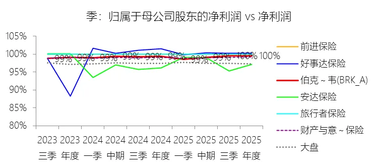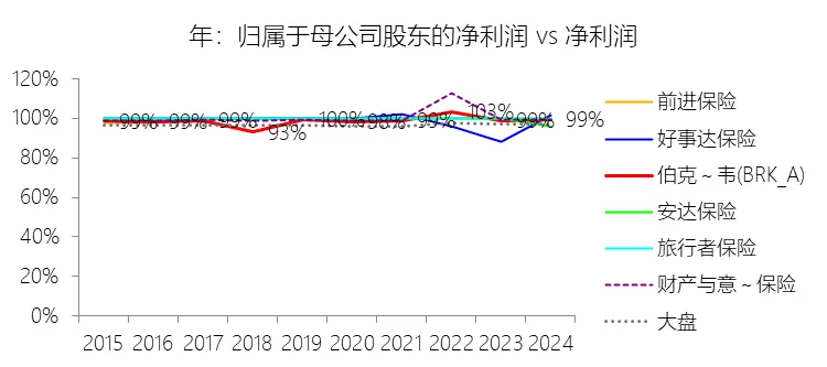 归属于母公司股东的净利润:2025年,伯克希尔哈撒韦-A的归属于母公司股东的净利润为669.68亿美元,同比减少24.75%,与净利润的比例为99.57%,同比上升0.2个百分点;2015-2024年(十年),此项合计为4734.52亿美元,平均比例为98.80%,比财产与意外伤害保险行业的均值低0.23个百分点,长期呈上升趋势。