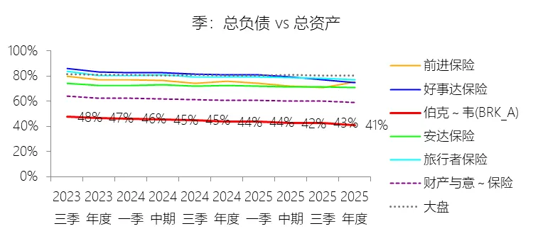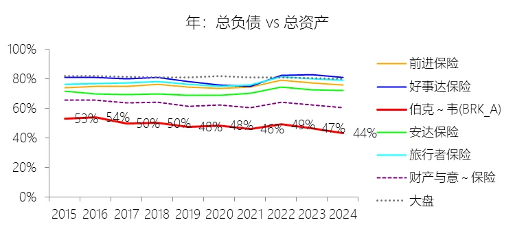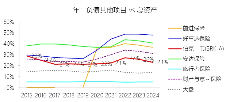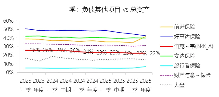 负债其他项目:2025年末,伯克希尔哈撒韦-A的负债其他项目为2739.31亿美元,对比年初增长1.9%,与总资产的比例为22.41%,同比下降0.88个百分点;2015-2024年(十年),此项合计为20096.05亿美元,平均比例为23.91%,比财产与意外伤害保险行业的均值低4.47个百分点,长期呈下降趋势。