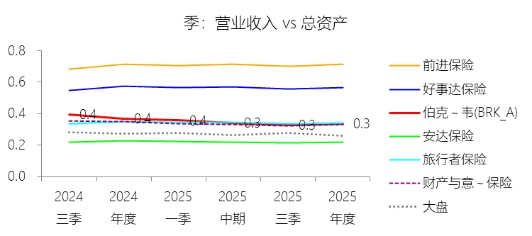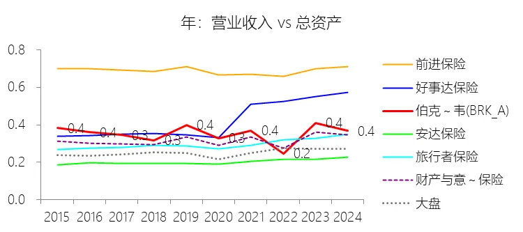 总资产周转率:2025年,伯克希尔哈撒韦-A的总资产周转率为0.3次,同比下降0.03次;2015-2024年(十年),平均总资产周转率为0.4次,比财产与意外伤害保险行业的均值高0.03次,长期呈下降趋势。