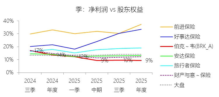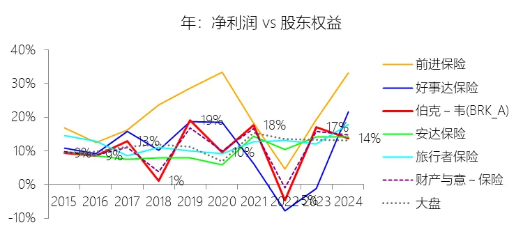 净利率:2025年,伯克希尔哈撒韦-A的净利润为672.60亿美元,同比减少24.9%,与营业收入的比例为16.38%(净利率),同比下降4.73个百分点;2015-2024年(十年),此项合计为4792.20亿美元,平均比例为16.15%,比财产与意外伤害保险行业的均值高3.12个百分点,长期呈上升趋势。比例短期下降主要由于2025年伯克希尔哈撒韦计入了对卡夫亨氏(Kraft Heinz)和西方石油(Occidental)高达82.55亿美元的非暂时性减值损失,且受资本市场波动影响,计入利润表的投资收益(含未实现公允价值变动)由2024年的415.58亿美元缩减至307.37亿美元。此外,非美国美元债务产生的汇兑收益在2025年转为亏损,且保险投资收益受利率下行及2024年末向母公司进行大额资本分配的影响而同比下降,导致在总营收降幅较小的情况下,净利润出现24.9%的显著下滑,从而稀释了净利率。比例长期上升主要由于自2018年起执行的新会计准则(ASU 2016-01)要求将权益证券持有期间的未实现损益直接计入净利润,这在过去十年的市场扩张期内大幅抬升了利润基数,同时公司保险浮存金从2015年的880亿美元稳步增长至2025年的1760亿美元,提供了极其庞大的低成本投资资本。加之2017年美国税改将企业所得税率从35%大幅降至21%,以及通过持续收购Alleghany、Pilot等企业不断扩充高毛利业务板块,共同推动了长期净利率的抬升。比例高于财产与意外伤害保险行业的均值主要由于伯克希尔并非纯粹的保险公司,其独特的“保险+铁路+能源+实业”多元化控股模式提供了极为稳健且互补的利润来源,非保险业务(如BNSF铁路和BHE能源)贡献了大量不受保险赔付周期影响的营业利润,有效对冲了行业波动。同时,公司凭借卓越的承保纪律,在过去20年中有18年实现了承保盈利,其承保利润率(3.3美分/1美元销售额)和以股权投资为主的资本运作效率远超以债券配置为主、业务单一的传统财产险同行。