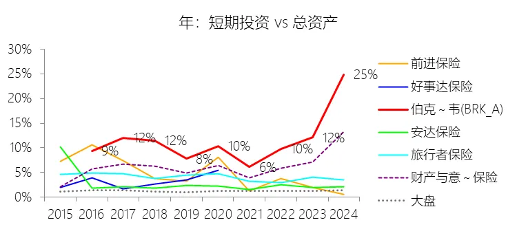 短期投资:2025年末,伯克希尔哈撒韦-A的短期投资为3214.34亿美元,对比年初增长12.2%,与总资产的比例为26.30%,同比上升1.47个百分点;2015-2024年(十年),此项合计为9457.21亿美元,平均比例为11.25%,比财产与意外伤害保险行业的均值高4.66个百分点,长期呈上升趋势。