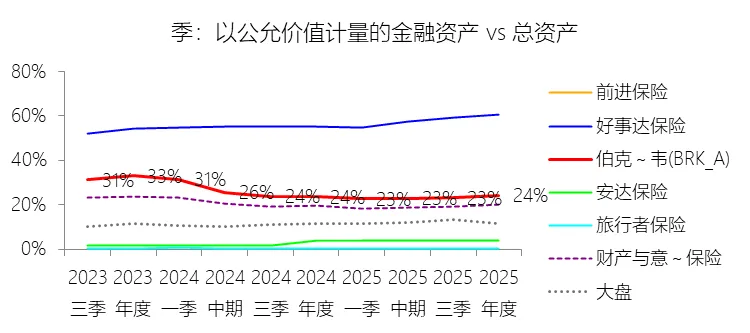 以公允价值计量的金融资产:2025年末,伯克希尔哈撒韦-A的以公允价值计量的金融资产为2977.78亿美元,对比年初增长9.64%,与总资产的比例为24.36%,同比上升0.83个百分点;2015-2024年(十年),此项合计为22922.71亿美元,平均比例为27.27%,比财产与意外伤害保险行业的均值高8.93个百分点,长期呈上升趋势。
