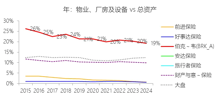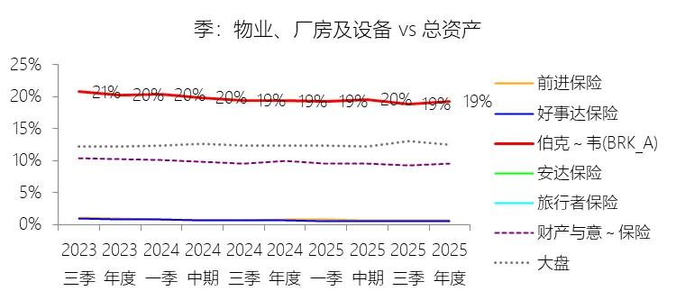 物业、厂房及设备:2025年末,伯克希尔哈撒韦-A的物业、厂房及设备为2351.60亿美元,对比年初增长5.49%,与总资产的比例为19.24%,同比下降0.08个百分点;2015-2024年(十年),此项合计为18119.91亿美元,平均比例为21.56%,比财产与意外伤害保险行业的均值高11.09个百分点,长期呈下降趋势。