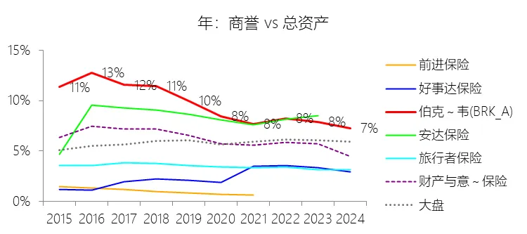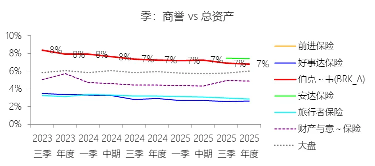 商誉:2025年末,伯克希尔哈撒韦-A的商誉为830.74亿美元,对比年初减少0.96%,与总资产的比例为6.80%,同比下降0.47个百分点;2015-2024年(十年),此项合计为7805.93亿美元,平均比例为9.29%,比财产与意外伤害保险行业的均值高3.21个百分点,长期呈下降趋势。