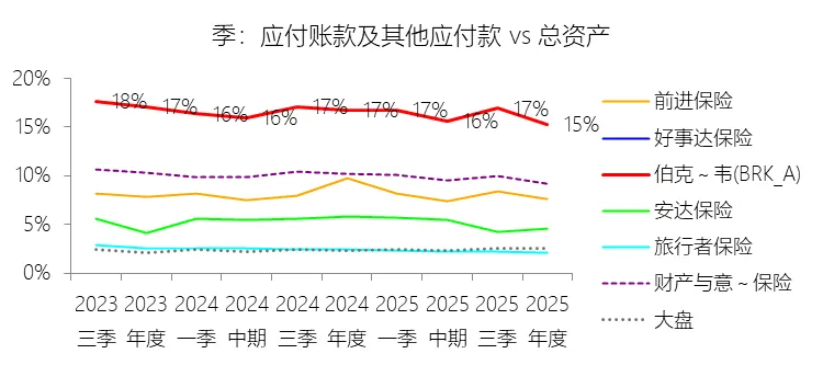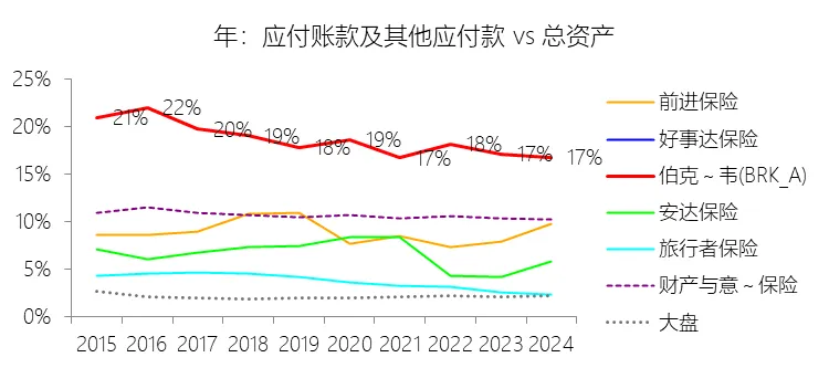 应付账款及其他应付款:2025年末,伯克希尔哈撒韦-A的应付账款及其他应付款为1865.17亿美元,对比年初减少3.48%,与总资产的比例为15.26%,同比下降1.49个百分点;2015-2024年(十年),此项合计为15428.36亿美元,平均比例为18.35%,比财产与意外伤害保险行业的均值高7.73个百分点,长期呈下降趋势。