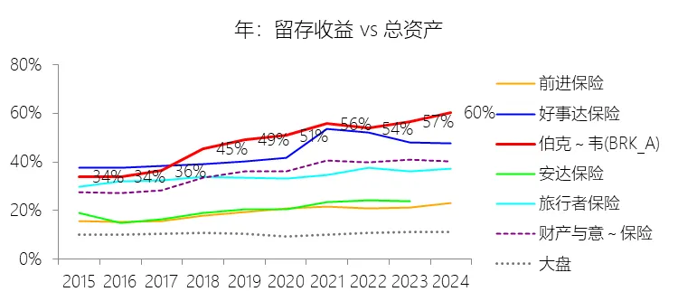 留存收益:2025年末,伯克希尔哈撒韦-A的留存收益为7631.86亿美元,对比年初增长9.62%,与总资产的比例为62.44%,同比上升2.11个百分点;2015-2024年(十年),此项合计为41716.82亿美元,平均比例为49.63%,比财产与意外伤害保险行业的均值高13.61个百分点,长期呈上升趋势。比例短期上升主要由于伯克希尔在2025年实现的669.68亿美元归母净利润被全部留存,这得益于公司自1967年以来始终坚持不派发股利的资本分配原则。在总资产受投资收益下降以及计提了82.55亿美元长期股权投资减值准备的影响下,2025年总资产增速仅为5.92%,显著低于留存收益9.62%的增幅,分子增速跑赢分母直接拉高了该比例。比例长期上升主要由于公司在过去数十年间坚定执行将所有盈余复利投入到具有“护城河”优势业务中的战略,使留存收益规模从2015年的1877亿美元增长至2025年的7631亿美元。同时,自2018年起执行的新会计准则(ASU 2016-01)要求将庞大股票组合的未实现公允价值变动直接计入利润表,这在过去十年的市场扩张周期中显著加速了账面留存收益的累积速度。比例高于财产与意外伤害保险行业的均值主要由于伯克希尔独特的“保险+实业”双引擎模式,其旗下的铁路(BNSF)、能源(BHE)及制造、零售等非保险板块贡献了海量且多元化的营业利润,且全部用于内部再投资。相比之下,传统保险公司通常会将很大一部分盈余以红利形式分配给股东,且受监管限制难以像伯克希尔这样大规模持有高增长的股权资产。此外,伯克希尔坚持极低债务杠杆和“金融堡垒”式的资产配置,使其庞大的权益资本对总资产的占比远超业务单一、高度依赖保费准备金负债杠杆经营的纯保险同行。