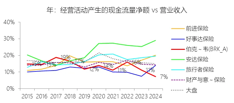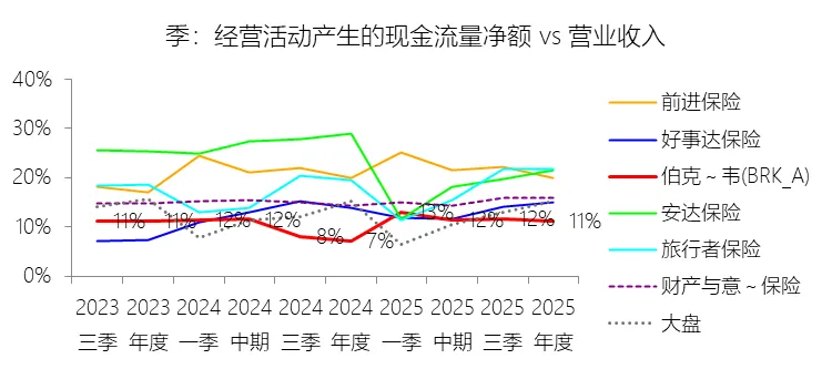 经营活动产生的现金流量净额:2025年,伯克希尔哈撒韦-A的经营活动产生的现金流量净额为459.69亿美元,同比增长50.26%,与营业收入的比例为11.20%,同比上升3.99个百分点;2015-2024年(十年),此项合计为3822.91亿美元,平均比例为12.88%,比财产与意外伤害保险行业的均值低2.02个百分点,长期呈下降趋势。比例短期上升主要由于2025年伯克希尔的所得税付现额由2024年的285.44亿美元显著降至139.78亿美元,这一约145亿美元的税收支出减少直接推动了经营活动现金流量净额的激增;同时,保险业务在2025年表现稳健,保险浮存金从1710亿美元增长至1760亿美元,持续贡献低成本的内生现金流,在总营收因投资损益波动而同比略降3.23%的背景下,现金流规模的增长带动了比例大幅回升3.99个百分点。比例长期下降主要由于自2018年起执行的新会计准则(ASU 2016-01)要求将庞大股票持仓的未实现公允价值变动计入营业收入和净利润,这在过去十年的市场扩张期内显著抬高了作为分母的营收基数,但由于这些收益是非现金性质的,在调节经营现金流时被全额扣除,导致账面比例被动稀释;此外,伯克希尔在过去十年间加速向实业化转型,铁路(BNSF)、能源(BHE)及制造等实业板块的营收占比不断提升,而这些资本密集型业务虽然产生大量现金流,但在获取比例上难以匹配早期以保险浮存金为主驱动的“轻资产、高现金”模式。比例低于财产与意外伤害保险行业的均值主要由于伯克希尔并非纯粹的保险机构,其营收中约有一半来自于制造、服务、零售以及受监管的基础设施业务,这些实业领域需要预先投入大量的原材料、劳动力及固定资产,不具备保险业特有的“先收保费、后赔付”产生的超高现金周转效率;同时,伯克希尔的总营收包含了受股市波动影响剧烈的投资损益项,这种巨大的分母稀释效应,使得其整体经营现金流与营业收入的比例在数值上逊色于业务集中在保费流入且营收口径较小的纯保险行业对手。