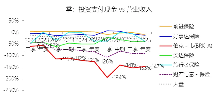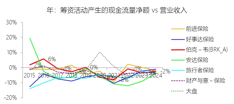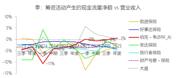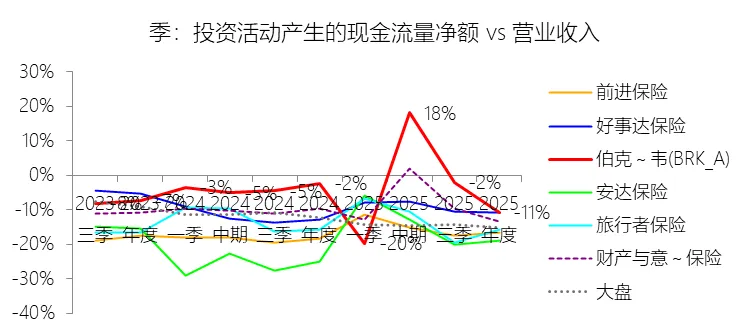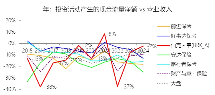 投资活动产生的现金流量净额:2025年,伯克希尔哈撒韦-A的投资活动产生的现金流量净额为-444.87亿美元,绝对值同比增长332.46%,与营业收入的比例为-10.84%,同比下降8.41个百分点;2015-2024年(十年),此项合计为-3306.21亿美元,平均比例为-11.14%,比财产与意外伤害保险行业的均值高0.5个百分点,长期呈上升趋势。比例短期下降主要由于2025年伯克希尔哈撒韦投资活动产生的现金流量净额由2024年的-102.87亿美元大幅降至-444.87亿美元,绝对值激增的核心原因在于权益证券的出售规模从去年的1433.59亿美元骤减至306.86亿美元,导致投资端现金流入显著回撤。即便同年通过美国国债及固定收益证券的到期赎回实现了5039.54亿美元的现金回笼,也未能完全对冲其购买同类资产产生的5861.29亿美元巨额支出,加之公司在2025年加大了权益证券的买入力度(169.23亿美元),使得整体投资净流出额在营收微降的背景下占比大幅走低。比例长期上升主要由于在过去十年间,虽然公司持续进行大规模的实业资本开支和证券买入,但其通过管理庞大的现金储备获得了日益增长的现金回笼,特别是2025年短期美国国债及固定收益证券的到期赎回金额已高达5039.54亿美元,这种巨额的内生现金流入有效冲抵了投资支出;同时,公司营业收入从2015年的2109亿美元稳步翻倍至2024年的4242亿美元,而投资净流出规模并未随营收规模同比例扩张,分子端的相对稳定与分母端的持续增长共同驱动比例在长期趋势中向零值靠拢(即绝对值占比收窄)。比例高于财产与意外伤害保险行业的均值主要由于伯克希尔作为多元化控股巨头,其营业收入(分母)除保险保费外,还包含了来自铁路、能源、制造及零售业务产生的超过2000亿美元的销售与服务收入。这种庞大的实业营收基础对投资活动的净流出产生了极强的稀释效应,使得伯克希尔的投资净流出对总营收的比例在数值上(-11.14%)显得比那些业务集中、营收规模较小且更依赖投资现金周转的纯财产险同行更高(即净流出相对更少)。