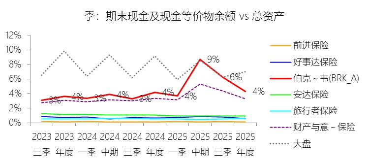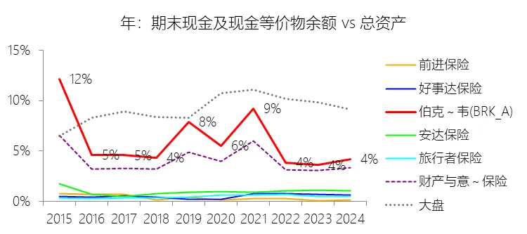 期末现金及现金等价物余额:2025年末,伯克希尔哈撒韦-A的期末现金及现金等价物余额为525.69亿美元,对比年初增长8.67%,与总资产的比例为4.30%,同比上升0.11个百分点;2015-2024年(十年),此项合计为4839.79亿美元,平均比例为5.76%,比财产与意外伤害保险行业的均值高1.75个百分点,长期呈下降趋势。